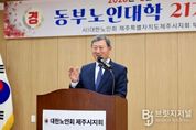 브릿지저널 정보영 기자 | 김완근 제주시장은 2월 11일 조천주민교류센터 회의실에서 열린 제21기 동부노인대학 졸업식에 참석해 축하 인사를 전했다. 이번 졸업식은 졸업생 32명과 내빈 등이 참석한 가운데 학사보고, 졸업증서 수여, 표창 수여, 축사 등의 순서로 진행됐다. 제주시 동부노인대학은 2년 과정의 교육프로그램으로, 어르신들의 삶의 질을 높이고 건강한 노후 생활을 지원하기 위해 운영되고 있다. 프로그램은 매주 화요일과 수요일 2시간씩 진행되며, 노인 교양, 건강관리, 정치·사회·시사 상식, 문화 체험 활동 등 다양한 내용으로 구성돼 있다. 김완근 제주시장은 “노인대학을 졸업하신 여러분께 진심으로 축하의 말씀을 드리고, 나이를 뛰어넘는 여러분의 열정과 도전은 우리 모두에게 큰 울림을 주고 있다”며, “병오년 새해 배움의 기쁨이 여러분의 삶의 버팀목이자 활력이 되어 언제나 건강하고 행복한 나날을 이어가시길 바란다”고 말했다.