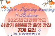 브릿지저널 윤나영 기자 | 원주시 평생교육원 학습관은 9월 22일부터 28일까지 2025년 라라밸학교 하반기 일일특강 운영 강좌(강사)를 모집한다. 라라밸학교(Life · Lifelong-learning Balance)는 시민들의 삶과 평생학습의 조화를 위해 다양한 일일특강 등 단기프로그램을 개설·운영하는 사업이다. 요리·공예·미술·운동 등 일일특강이 가능한 분야를 대상으로 강좌를 공개모집하고 있다. 강좌 신청은 9월 22일부터 28일까지 전자우편으로 접수한다. 제출 서류 등 세부 내용은 학습관 홈페이지에 게시된 공고문에서 확인할 수 있다. 이번 모집에 선정된 10개 강좌는 11월 1일 학습관에서 일일특강으로 진행될 예정이다. 윤석재 학습관장은 “시민들이 다양한 평생학습 프로그램을 접하고 배움의 기쁨을 느끼는 행복한 일상을 보낼 수 있도록 더욱 힘쓰겠다”라고 말했다.