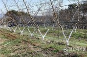 브릿지저널 김경미 기자 | 옥천군농업기술센터는 최근 낮과 밤의 기온 차가 커지는 기상 여건이 지속됨에 따라, 복숭아 재배 농가를 대상으로 겨울철 동해(언 피해) 예방을 위한 철저한 과원 관리를 당부했다. 센터에 따르면, 1월 하순부터 2월 초는 한겨울 혹한기보다 오히려 동해 발생 위험이 높은 시기다. 낮 동안 햇빛을 받아 나무줄기(주간부)의 온도가 상승해 조직이 해동된 상태에서, 밤사이 기온이 급격히 떨어질 경우 수피가 얼어 터지는 동해가 발생하기 쉽기 때문이다. 특히 복숭아나무는 추위에 비교적 약해, 한 번 동해를 입으면 나무 세력이 급격히 약화되고 심할 경우 고사로 이어질 수 있어 사전 예방이 무엇보다 중요하다. 가장 효과적인 예방 방법으로는 나무줄기에 백색 수성 페인트를 도포하거나, 볏짚·신문지·부직포 등을 활용한 보온 덮개를 감싸주는 방법이 있다. 나무줄기 지면에서 약 80cm~1m 높이까지 백색 수성 페인트를 바르면, 낮 동안 태양열로 인한 줄기 온도 상승을 억제해 밤낮의 온도 편차를 줄일 수 있다. 이는 동해 예방은 물론, 월동 병해충의 잠복처를 줄이는 데에도 도움이 된다. 다만 페인트