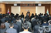 브릿지저널 김경미 기자 | 충북 영동군이 2026년 병오년(丙午年) 새해를 맞아 2일 군청 대회의실에서 시무식을 열고 군정 비전과 목표를 공유하며 새로운 도약을 다짐했다. 이날 시무식에서 영동군수는 신년사를 통해 “2026년은 그동안 준비해 온 성과를 바탕으로 영동군이 한 단계 더 도약하는 전환점이 될 중요한 해”라며 “‘유지경성(有志竟成)’이라는 신년 화두 아래, 뜻을 세우고 끝까지 실천하는 군정을 펼쳐 나가겠다”고 강조했다. 영동군은 ‘2025 영동세계국악엑스포’를 성공적으로 마무리하고, 국립국악원 영동분원 타당성 조사 용역비를 정부 예산에 반영해 분원 유치가 본격화됐다며, 이를 통해 영동이 전국 최고의 국악문화도시로 도약할 탄탄한 기반을 마련했다고 평가했다. 또한 올해 지속 가능한 군정 운영을 위해 △앞서가는 미래 농업 육성 △생동하는 지역경제 활성화 △머무르는 힐링 관광 기반 조성 △감동 주는 맞춤형 복지 확대 △만족하는 열린 행정 구현 등 5대 군정 목표를 중점 추진할 계획이다. 미래 농업 분야에서는 스마트농업 확대 보급과 과수 농업 경쟁력 강화, 농업기계 임대사업장 확충 등을 통해 안정적