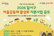 브릿지저널 김진석 기자 | 대구 달서구는 주민이 스스로 마을에 필요한 사업을 발굴하고 실행하는 ‘2026년 마을공동체 활성화 지원사업’ 참여자를 2월 13일까지 모집한다. 올해로 7년째를 맞는 달서구 마을공동체 활성화 지원사업은 2020년부터 현재까지 총 79건의 사업을 지원해 왔으며, 탄소중립 실천, 공동텃밭, 공동육아, 소외계층 돌봄, 마을축제 등 다양한 분야에서 주민 주도의 마을문제 해결과 공동체 기반 확충에 기여하고 있다. 이번 공모는 총 3개 분야로 15개팀 내외를 선정해 공동체 역량과 사업 성격에 따라 단계별로 사업비를 지원한다. 지원 규모는 ▲ 신규 공동체를 위한 ‘신참마을’ 200만원 이내 ▲ 경험 있는 공동체를 위한 ‘도약마을’ 300만원 이내 ▲ 마을축제 등을 위한 ‘주민화합행사’ 500만원 이내이다. 신청 자격은 5인 이상 달서구 주민 모임 또는 단체이며, ‘주민화합행사’는 10인 이상이 참여해야 한다. 또한 교육·환경·복지·안전·문화 등 마을에 필요한 다양한 분야에서 다수 주민이 공감하고 함께 참여할 수 있는 공익성 사업이어야 한다. 신청 서식과 자세