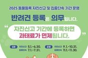 브릿지저널 김경미 기자 | 양천구는 반려동물의 유실·유기 방지와 체계적인 관리 강화를 위해 오는 10월 31일까지 ‘동물등록 자진신고 기간’을 운영한다고 9일 밝혔다. 현행 동물보호법에 따르면 2개월령 이상의 반려견은 의무적으로 동물등록 대상이며, 소유자 정보나 동물의 상태가 변경(유실, 되찾음, 사망 등)된 경우에도 반드시 변경 신고를 해야 한다. 구는 소유자의 자발적 동물등록을 유도하고 등록 미비로 발생하는 각종 문제를 사전에 차단하기 위해 자진신고 기간을 운영하고 있으며, 이 기간에 신규 등록하거나 변경사항을 신고하면 미등록·미신고에 따른 과태료를 면제하고 있다. 동물등록은 구에서 대행기관으로 지정한 동물병원을 방문해 진행하면 된다. 등록 방식은 마이크로칩을 피하에 삽입하는 내장형과 목걸이 형태로 부착하는 외장형 중 선택할 수 있다. 변경 신고는 동물등록 대행기관을 통해 접수하거나, ‘정부24’ 또는 ‘국가동물보호정보시스템’에서 온라인으로도 가능하다. 구는 특히 내장형 동물등록을 진행한 소유주에게 동물등록비도 지원하고 있다. 올해는 총 250마리를 대상으로 지원하며, 동물등록 대행기관에서 내장