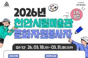 브릿지저널 정보영 기자 | 천안문화재단은 오는 31일까지 천안시립미술관 문화자원봉사자 2차 모집을 추진한다고 18일 밝혔다. 문화자원봉사자는 미술관과 관람객을 이어주는 매개자로, 누구나 미술관을 친근하고 편안하게 찾을 수 있는 공간으로 만들어 가는 역할을 하게 된다. 문화예술에 관심이 있는 20세 이상 성인이라면 누구나 참여할 수 있으며, 문화자원봉사자로 선발되면 내달부터 2027년 2월까지 전시 해설, 관람 안내, 질서 유지, 행사 지원 등 다양한 활동을 수행하게 된다. 문화자원봉사자에게는 봉사실적 인정, 교육, 소정의 활동비 등 혜택이 제공될 예정이다. 지원 희망자는 천안시립미술관 누리집에서 신청서를 내려받아 전자우편으로 접수하면 된다. 서류 및 인터뷰 심사를 통해 활동 의지와 전문성 등을 종합적으로 평가할 예정이며, 최종합격자에게는 내달 10일 개별 통보된다. 자세한 사항은 천안시립미술관 누리집을 참고하면 된다.