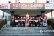 브릿지저널 김경미 기자 | 지난 12일 여주시와 경기 사회복지공동모금회는 연말연시 나눔문화 확산을 위한'희망2026 나눔캠페인'의 시작을 알리는 사랑의 온도탑 제막식을 개최했다. 이번 캠페인의 슬로건은 “행복을 더하는 기부, 기부로 바꾸는 여주”로 이충우 여주시장, 박두형 여주시의회 의장 및 시의원, 김효진 경기 사회복지공동모금회 사무처장 등 10여명이 참석하여 제막식과 슬로건 피켓팅을 통해 홍보활동을 진행했다. '희망2026 나눔캠페인'은 2025년 12월 1일부터 2026년 1월 31일까지 62일간 여주시 지정기탁 모금액 4억원을 목표로 각 읍면동 및 본청에서 모금을 접수하며, 목표액의 1퍼센트인 4백만원의 성금이 모금될 때마다 사랑의 온도탑의 온도가 1℃씩 올라간다. 집중모금기간동안 모금된 성금 등은 사회복지공동모금회를 통해 여주시 지정기탁금 계좌로 적립되어 관내 취약계층 및 사회복지시설 등을 위한 복지사업의 재원으로 소중히 사용될 예정이며, 많은 시민들의 관심과 참여를 촉구하는 뜻깊은 자리였다.