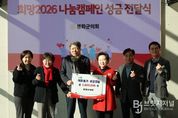 브릿지저널 정보영 기자 | 2025년의 마지막 날인 31일, 고령군에는 한 해를 마무리하며 이웃을 돕고자 하는 온정의 손길이 끝을 모르고 이어졌다. 고령군은 이날 관내 단체 및 기업 등 총 5곳에서‘희망2026 나눔캠페인’성금을 기탁하며 2025년 나눔의 대미를 장식했다고 밝혔다. 먼저 ㈜참미푸드(대표 김정훈)에서 사랑의 물품(흑마늘농축액 100박스, 핫팩(120개) 72박스)과 교육발전기금 100만원을 전달했다. 이어 농협 고령축산물공판장(장장 김성수)에서 1,000만원, 고령읍교회(목사 김명수)에서 200만원, 해동기술개발공사(대표 구용호)에서 500만원, 세원그린(대표 양동식)에서 200만원을 기탁하며 릴레이 나눔에 동참했다. 이날 기탁식에 참여한 대표자들은 “다사다난했던 한 해를 마무리하며, 우리 주변의 어려운 이웃들이 희망찬 새해를 맞이할 수 있도록 작은 정성을 모았다며, 앞으로도 고령군의 발전을 위해 나눔 활동을 지속하겠다”고 소감을 밝혔다. 고령군관계자는 “경제적으로 어려운 시기임에도 불구하고 마지막 날까지 나눔을 실천해 주신 5곳의 기탁자분들께 진심으로 감사드린다며, 보내주신 성금은 2026년 새해에도 소외된