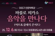 브릿지저널 김경미 기자 | 마포구는 오는 12월 6일 오전 10시부터 12시까지 마포중앙도서관 6층 마중홀에서 연말 인문학특강 ‘파블로 피카소, 음악을 만나다(아트&클래식 콘서트)’를 개최한다. 이번 특강은 전문 도슨트와 정상급 클래식 연주자들이 함께해 예술과 음악이 어우러진 특별한 문화 경험을 구민들에게 제공하고자 마련됐다. 프로그램은 국민대 미술이론 박사과정을 밟고 바티칸·오르세 박물관 등에서 도슨트로 활동한 이창용 도슨트가 강연을 맡아 파블로 피카소의 삶과 그의 작품 세계를 쉽고 흥미롭게 풀어낸다. 전문 해설을 통해 피카소의 예술적 감각과 시대적 배경, 작품에 담긴 메시지를 입체적으로 이해할 수 있도록 구성했다. 파블로 피카소 작품 해설과 함께 정상급 클래식 연주자들의 무대가 어우러진다. 이소란·변현정 바이올리니스트, 이신규 비올리스트, 장우리 첼리스트, 이현진 피아니스트 등 국내 음악계에서 활발히 활동 중인 연주자들이 참여해 모차르트 디베르티멘토 라장조, 쇼팽 녹턴 2번, 알렉산드로 보로딘 현악 4중주 2번 3악장, 모리스 라벨의 죽은 왕녀를 위한 파반느 등 다채로운 곡을 선보인