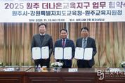 브릿지저널 윤나영 기자 | 강원특별자치도교육청은 원주시, 원주교육지원청과 11월 18일 원주시청에서 ‘원주 더나은교육지구 연장지정 업무협약’을 체결했다. 이번 협약은 2018년 제1기 4년, 2022년 제2기 4년 운영에 이어 2026년부터 4년간 제3기 더나은교육지구 사업을 새롭게 추진하기 위해 마련됐다. 세 기관은 ‘배움과 성장, 문화예술로 동행하는 원주’라는 비전 아래 학교와 지역이 함께 성장하는 지속가능한 교육생태계 조성을 위해 매년 4억 원(교육청 2억 원, 군 2억 원)을 공동 지원한다. 원주 더나은교육지구는 학생의 전인적 성장을 지원하는 지역 중심 교육협력 사업으로, 학교·지자체·지역사회가 협력하는 ‘배움과 성장의 지역교육공동체’를 구축하고 있다. 지구중점 공동사업으로 △‘원주 한바퀴’ 원주 탐방 프로젝트 △‘원주 한바탕’ 원주 체험 프로젝트를 운영해 학생들이 지역의 역사·문화·자연을 탐방하며 원주 시민으로서의 정체성과 자긍심을 기를 수 있도록 돕는다. ‘예술 피움’ 사업은 △‘꿈키움’ 찾아가는 문화예술 소공연 △‘꿈그림’ 그림책·영상 창작 프로젝트 △‘꿈도약’ 리더십 스포츠 프로그램