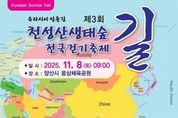 브릿지저널 김경미 기자 | 양산시는 11월 8일 오전 9시 웅상체육공원에서 '제3회 천성산생태숲길 전국걷기축제'가 개최된다고 밝혔다. 이번 행사는 (사)양산도시문화연구원이 주최·주관하고, 양산시와 (사)한국걷는길연합이 후원한다. ‘유라시아의 첫길, 천성산에서 유라시아로 가다’를 주제로 열리는 이번 축제는 천성산의 아름다운 숲길을 걸으며 생태와 문화, 평화의 가치를 공유하는 전국 규모의 걷기 행사다. 특히 ‘천 가지 이야기를 품은 천성산’이라는 부제를 통해 천성산의 생태적 가치와 역사문화 자원을 널리 알리고 지역민의 자긍심을 고취하는 데 의미를 두고 있다. 행사는 천성산을 사랑했던 고(故) 허영호 대장을 기리며, 대한민국 대표 산악인 최오순 산악인과 함께 걷는 특별 프로그램이 마련돼 있다. 또 웅상체육공원을 출발해 천성산생태숲길 주요 구간을 걷는 4개 코스가 마련돼 있어 남녀노소 누구나 참여할 수 있다. 참가 신청은 양산도시문화연구원 홈페이지 또는 포스터의 QR코드를 통해 가능하다. 양산시 관계자는 “천성산생태숲길은 양산의 대표적인 자연생태자원이자 시민과 관광객 모두가 즐길 수 있는 힐링 명소”라며