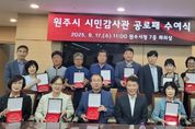 브릿지저널 윤나영 기자 | 원주시는 지난 17일 시청 7층 회의실에서 시민감사관 공로패 수여식을 개최했다. 시는 투명하고 깨끗한 행정을 위해 헌신적이고 적극적으로 활동한 제5기 시민감사관 22명에게 공로패를 수여했다. 원주시 시민감사관 제도는 2015년부터 운영됐으며, 이를 통해 시정의 감시 기능을 강화하고 민생 현장의 불편을 신속히 해결해 왔다. 특히 시민감사관은 시정에 대한 독립적인 감사를 통해 주민들의 고충을 해결하고 시정의 투명성을 높이는 데 중요한 역할을 했다. 김문기 원주부시장은 “시민들의 목소리를 가까이에서 경청하고 불편을 해결하는 데 헌신하신 노고에 깊이 감사드린다”라며, “앞으로도 원주시 발전에 이바지해 주시길 부탁드린다”라고 말했다.