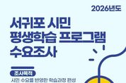 브릿지저널 정보영 기자 | 서귀포시는 시민 의견을 바탕으로 2026년도 평생학습 프로그램 편성을 준비하고 분야별 강사를 공개모집하기 위해 온라인 수요조사를 진행한다. 이번 조사는 만 19세 이상 서귀포 시민을 대상으로 9월 15일부터 9월 30일까지 진행되며, 네이버 폼을 통해 간편하게 참여할 수 있다. 서귀포시는 시민 누구나 부담 없이 설문에 참여할 수 있도록 문항을 성별·연령·거주지 등 응답자 정보, 평생학습 참여 경험, 선호 시간대, 원하는 프로그램 유형 등 12개로 간결하게 설계했다. 수집된 결과는 2026년 서귀포시 평생학습관 프로그램 편성과 강사 공모, 읍면동 평생학습센터 운영 등 지역별 평생학습 지원 정책 마련에 활용될 예정이다. 특히 지역에서 활동하는 전문가들의 강사 활동 참여 기회를 확대하고 교육 내용의 다양성과 질을 높이기 위한 강사풀 공개모집의 분야별 인원 배정에도 직접 반영된다. 강사풀 공개모집은 10월 말 예정이며, 세부 내용은 추후 공고될 예정이다. 서귀포시 관계자는 “이번 설문조사 결과를 적극 반영하여 시민의 다양한 요구에 맞춘 평생학습 기회를 제공하겠다”라며
