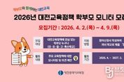 브릿지저널 정보영 기자 | 대전시교육청은 2026년 대전 교육 정책 학부모 모니터를 4월 2일부터 9일까지 각급 학교 학부모를 대상으로 모집한다고 밝혔다. 대전 교육 정책 학부모 모니터단은 교육 정책 전반에 대한 학부모의 다양한 의견을 체계적으로 수렴하여 정책에 반영하고, 교육 공동체 간 소통을 활성화함으로써 정책에 대한 이해도를 높이기 위해 운영하고 있다. 이를 통해 교육 수요자의 요구와 현장의 목소리를 반영한 공감형 교육 정책 추진을 도모하고 있다. 지난해에는 학부모 875명으로 대전 교육 정책 학부모 모니터단을 구성하여 ‘사전 정보 공표 운영 만족도 조사’ 등 총 17건의 대전 교육 정책 관련 온라인 설문 조사를 실시했다. 조사 결과를 면밀히 분석하여 정책 개선에 43건을 반영했으며, 모니터단 활동에 적극 참여한 우수 학부모 모니터 27명에게 교육감 표창을 수여했다. 학부모 모니터는 대전 교육 정책에 관심이 있는 학부모라면 누구나 지원할 수 있다. 모니터단으로 선정된 학부모는 4월부터 내년 2월까지 활동하며 ‘IB 프로그램에 대한 인식 및 요구 조사’ 등 총 17개 대전 교육 정책 전반에 대한 온라인 설문