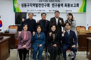 브릿지저널 김경미 기자 | 성동구의회는 지난 24일 의원연구단체 ‘성동지역발전연구회(대표의원 박영희)’ 최종보고회를 개최했다고 밝혔다. 성동지역발전연구회는 성동구 권역별 특성에 맞는 정책을 모색하기 위해 박영희(대표)·이현숙(간사)·엄경석·정교진·주복중 의원이 구성한 의원연구단체로, 지난 7월부터 성동구의 지속 가능한 발전과 주민 삶의 질 향상을 위한 연구활동을 계속해 왔다. 이날 최종보고회에는 연구단체 의원, 용역 수행업체인 한국능률협회컨설팅 관계자, 의회사무국 직원이 참석해 약 4개월 간의 연구용역의 결과물을 최종적으로 공유했다. 성동지역발전연구회는 이번 연구단체 활동을 통해 성동구를 4개 권역으로 구분하고 지역현안 및 여건을 분석해 권역별 맞춤형 정책과제를 도출했다. 아울러 그 과정에서 권역별 주민간담회를 실시함으로써 정책 현장의 목소리인 주민의 의견을 적극적으로 수용했다는 점에서 큰 의미가 있다. 박영희 대표의원은 “성동지역발전회가 마련한 권역별 정책과제들은 진정으로 민·관이 함께 만들어 낸 정책”이라며, “향후 의회 차원의 지역발전 정책 추진 시 적극적으로 반영될 수 있도록 하겠다”라고 전