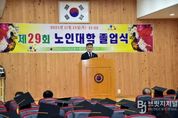 브릿지저널 윤나영 기자 | 김제시는 대한노인회 김제시지회가 지난 13일, 지회 2층 강당에서 제29회 노인대학 졸업식을 성황리에 개최했다고 밝혔다. 이날 행사에는 노인대학생 190여 명을 비롯해 노인회 임원, 내외빈 등 약 230명이 참석해 졸업생들의 새로운 출발을 함께 축하했다. 행사는 ▲노인강령 낭독, ▲학사보고 및 졸업증 수여, ▲시상식 순으로 진행됐으며, 정성주 김제시장과 서백현 김제시의회 의장 등 주요 내빈이 참석해 졸업생들에게 축하와 격려의 뜻을 전했다. 특히, 올해 졸업생들은 수개월 동안 다양한 교양·건강·문화 교육을 통해 평생학습의 가치를 실천해 왔으며, 지역사회 참여와 공동체 활동에도 적극적으로 동참해 의미를 더했다. 정 시장은 “오늘의 졸업은 끝이 아니라 새로운 시작”이라며 “오랜 기간 배움을 이어온 어르신들의 열정은 우리 지역사회의 귀감이 되고 있다”고 전했다. 이어 “꾸준한 학습을 통해 얻은 지혜와 경험이 앞으로의 삶뿐 아니라 지역 공동체에도 큰 힘이 될 것”이라며 “김제시는 어르신들이 더 건강하고 활기찬 노후를 보내실 수 있도록 어르신들을 위한 다양한 건강·여가·