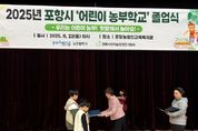 브릿지저널 정보영 기자 | 포항시는 22일 농업인교육복지관에서 2025년 하반기 ‘어린이농부학교’ 졸업식을 진행했다. 이날 행사에는 수료 어린이와 가족, 관계자 등 80여 명이 참석해 지난 4개월간의 활동을 돌아보고 성장을 함께 축하하는 시간을 가졌다. 졸업식은 텃밭 골든벨 퀴즈, 수료증 및 기념품 전달, 소감 발표, 단체사진 촬영 순으로 진행됐다. 포항시 어린이농부학교는 상·하반기로 운영되며, 이번 하반기 과정은 8월부터 11월까지 매주 토요일 총 12회차 프로그램으로 구성됐다. 참여한 어린이 30명 전원이 성실히 전 과정을 마치고 졸업장을 받았다. 교육은 텃밭 채소 재배, 벼 베기 및 탈곡 체험, 환경 감수성을 기르는 활동 등 이론과 실습을 병행한 도시농업 프로그램으로 구성돼 높은 호응을 얻었다. 특히 커피박 유기비료 만들기, 누에 키우기, 허수아비 만들기, 수확 작물로 진행한 팜파티 등 체험 중심 프로그램이 큰 인기를 끌었으며, 가족 단위로 참여할 수 있어 교육 효과도 더욱 높았다는 평가다. 이현주 포항시 농업기술센터 소장은 “어린이들이 흙을 만지고 작