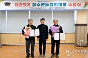 브릿지저널 윤나영 기자 | 장수군은 2일 장수군농업기술센터에서 최훈식 장수군수와 최한주 군의회 의장, 수료생 80여 명이 참석한 가운데 ‘제23기 장수군 농업인대학 수료식’을 개최했다고 밝혔다. 올해 장수군 농업인대학은 지난 3월에 개강해 11월까지 농업인의 전문능력 향상을 위해 사과·두릅·지속가능한 치유농업 등 총 3개 과정을 편성해 교육생 132명을 대상으로 진행했다. 교육은 이론 수업과 현장 실습을 병행한 총 37회, 175시간의 체계적인 프로그램으로 구성됐으며, 이를 통해 장수농업을 선도할 수 있는 87명의 수료생을 배출했다. 수료식에서는 올해 교육 운영 과정에서 자치활동에 공로가 큰 백승덕 교육생에게 공로상이 수여됐으며, 김연수·김형중 교육생이 전 과정을 우수한 성적으로 이수해 우수상을 받았다. 다양한 지역 농업인들이 함께 참여한 본 과정은 단순한 기술 습득을 넘어 농업경영 역량을 강화하는 데 실질적 도움이 된 것으로 평가되고 있다 수료생들은 “농업인대학에서 배운 지식과 경험을 현업에 적용해 고품질 농산물 재배와 효율적인 경영관리로 소득을 높이는데 도움이 되는 유익한 시간이었다