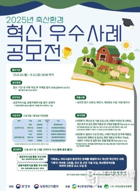 브릿지저널 김경미 기자 | 환경부와 농림축산식품부는 ‘2025년 축산환경 혁신 우수사례’를 8월 18일부터 9월 12일까지 공모한다고 밝혔다.