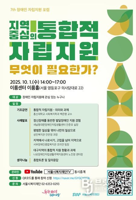 포럼은 온오프라인으로 동시에 진행되며, 재단 유튜브 채널 ‘서울시복지재단TV’를 통해 누구나 시청할 수 있다. 수어통역도 실시간으로 제공될 예정이며, 참여자는 포스터 내 QR코드 또는 링크를 통해 9월 28일까지 사전 모집한다.