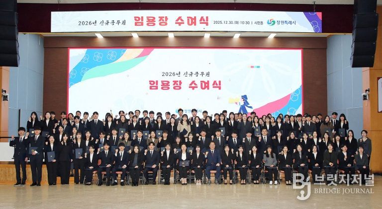 브릿지저널 김경미 기자 | 창원특례시는 30일 시청 시민홀에서 ‘2026년 신규공무원 임용장 수여식’을 개최하고, 신규공무원 112명에게 임용장을 수여했다.