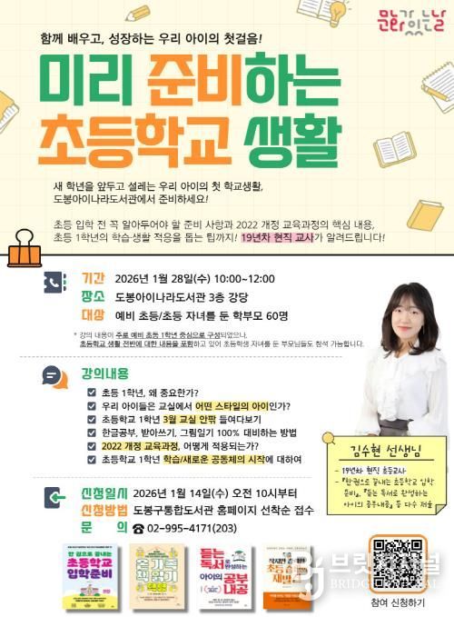 브릿지저널 김경미 기자 | 서울 도봉구 도봉아이나라도서관이 오는 1월 28일 (예비)초등 자녀를 둔 학부모를 대상으로 ‘미리 준비하는 초등학교 생활’ 특강을 개최한다.