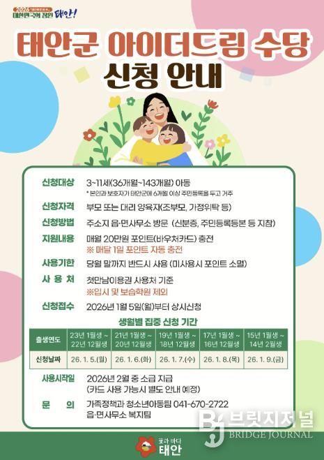 브릿지저널 정보영 기자 | 태안군이 정부 지원이 급격히 줄어드는 3세 이후 아동의 양육 부담을 덜어주기 위해 신설한 ‘아이더드림 수당’의 본격적인 신청 접수에 돌입했다.