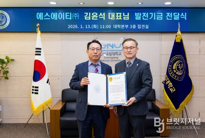 브릿지저널 김경미 기자 | 경상국립대학교는 1월 13일 오전 11시 대학본부 3층 접견실에서 ‘에스에이티(주) 대학발전기금 전달식’을 개최했다.