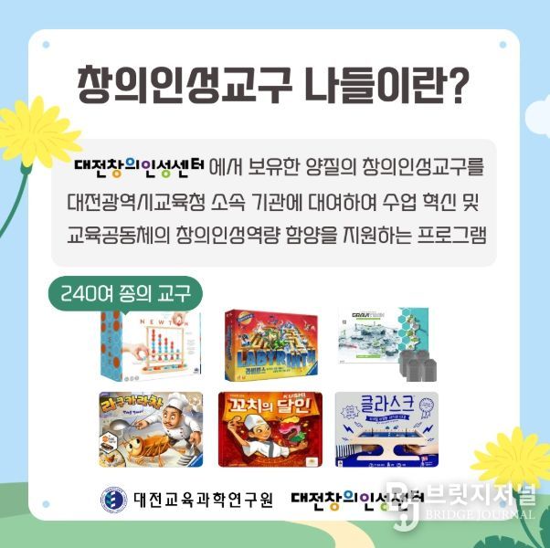 브릿지저널 정보영 기자 | 대전시교육청 대전교육과학연구원 대전창의인성센터는 대전 관내 초·중·고등학교 및 대전시교육청 소속 기관을 대상으로 2026년 3월부터 2027년 1월까지 창의인성교구 대여 사업인 ‘창의인성교구 나들이’를 실시한다고 밝혔다.