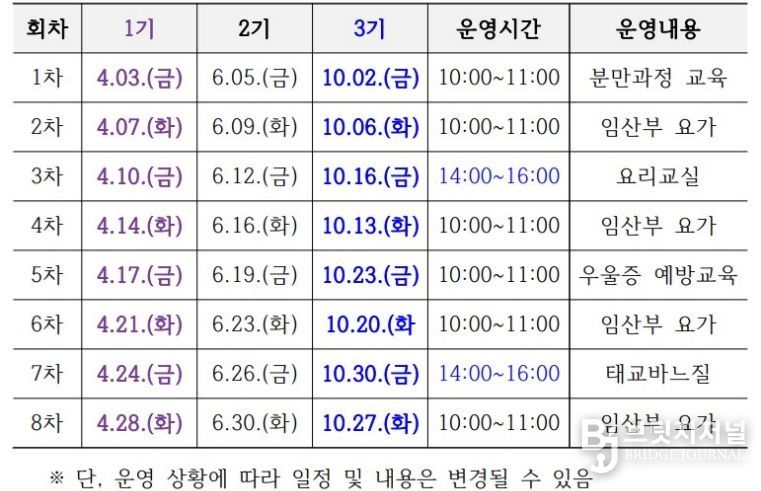 프로그램은 임산부 요가교실을 비롯해 분만 과정 이해, 이유식 만들기, 태교 바느질, 산전·산후 우울증 예방 교육 등 전문가 특강으로 구성된다.