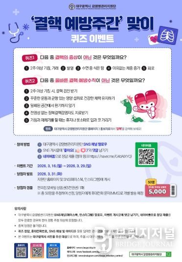 브릿지저널 김진석 기자 | 대구광역시 감염병관리지원단은 ‘제16회 결핵예방의 날’(3.24.)과 ‘결핵 예방주간’(3.22.~28.)을 맞아 시민들의 결핵 예방 인식을 높이기 위한 온라인 퀴즈 이벤트를 개최한다.