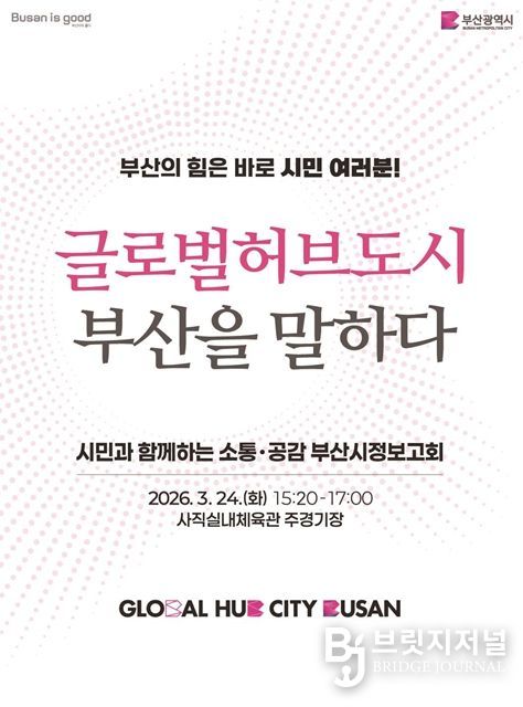 브릿지저널 윤나영 기자 | 부산시는 오는 24일 오후 3시 20분 사직실내체육관 주경기장에서 시민과 지역 주요 인사 등이 참석한 가운데 '글로벌허브도시 부산을 말하다' 시정보고회를 개최한다고 밝혔다.