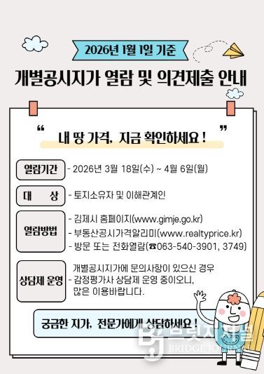 브릿지저널 윤나영 기자 | 김제시는 2026년 1월 1일 기준으로 조사․산정한 개별공시지가 총 307,692필지에 대해 18일부터 오는 4월 6일까지 열람 및 의견 접수를 실시한다고 밝혔다.