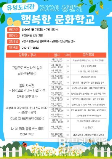 브릿지저널 정보영 기자 | 대전 유성구는 4월부터 7월까지 주민의 문화 향유 기회를 확대하고 정서적 치유를 지원하기 위한 ‘2026년 상반기 행복한 문화학교’를 운영한다.
