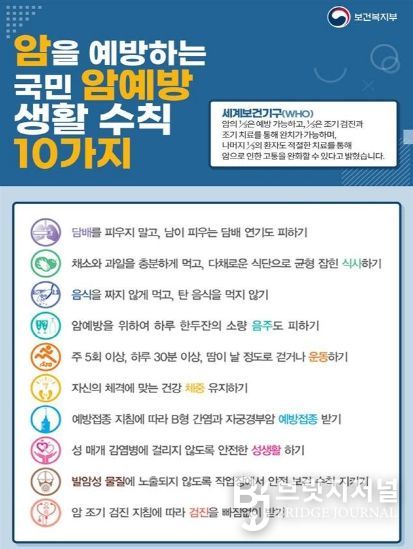 주요 수칙으로는 ▲금연·금주 ▲균형잡힌 식단으로 싱겁게 먹기 ▲주 5회 이상 운동 및 건강 체중 유지 ▲예방접종(B형 간염, 자궁경부암) ▲정기적인 암 검진 등이 있다.