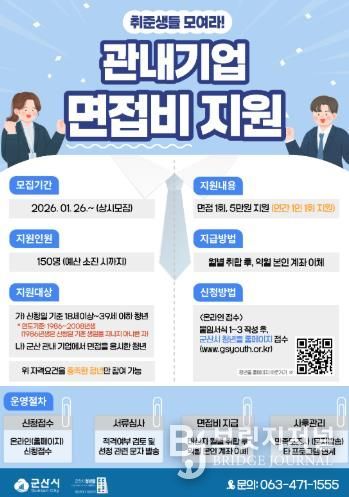 브릿지저널 윤나영 기자 | 군산시 청년뜰에서는 청년 구직자의 경제적 부담을 완화하고 적극적인 구직 활동을 장려하기 위해 ‘청년 구직자 관내 기업 면접비 지원사업’을 운영한다고 밝혔다.