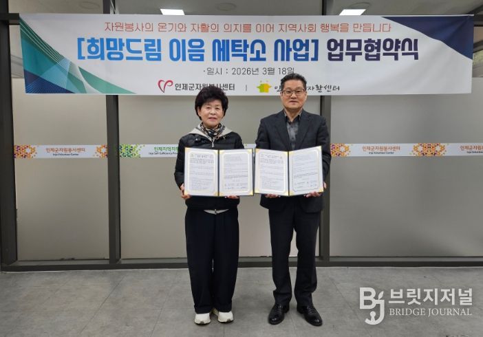 인제군자원봉사센터와 인제지역자활센터는 3월 18일 센터 교육실에서 ‘행복드림 이음세탁소’ 사업 추진을 위한 업무협약(MOU)을 체결했다고 밝혔다.
