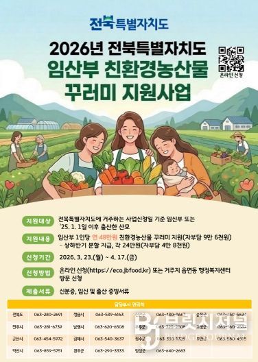 브릿지저널 윤나영 기자 | 전북특별자치도가 임산부의 건강 증진과 친환경 농산물 소비 확대를 위해‘임산부 친환경농산물 꾸러미 지원사업’신청을 오는 3월 23일부터 4월 17일까지 모집한다고 19일 밝혔다.