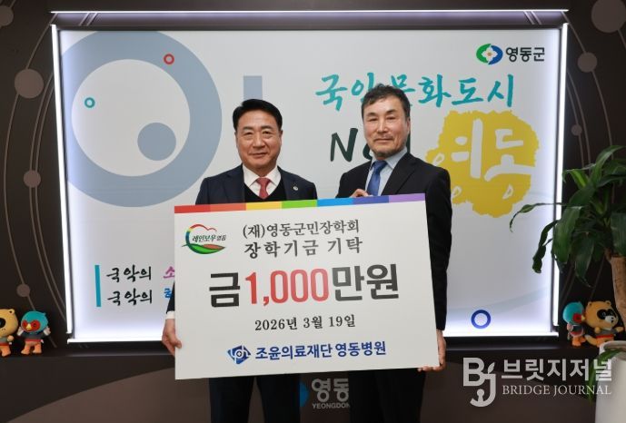 브릿지저널 김경미 기자 | 조윤의료재단 영동병원(이사장 윤왕영)은 19일 영동군청을 방문해 지역 미래 인재 육성을 위한 장학금 1,000만 원을 (재)영동군민장학회에 기탁했다.