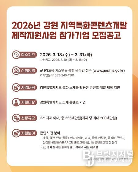 브릿지저널 윤나영 기자 | 강원문화재단에서는 강원지역 우수 콘텐츠 발굴 및 지역 콘텐츠 기업의 성장을 도모하기 위한 공모사업을 진행한다.