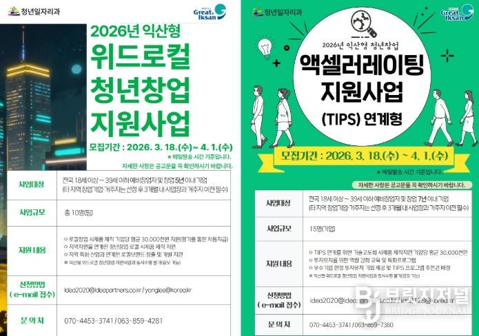 익산시는 '2026년 익산형 위드로컬 청년창업 지원사업'과 '2026년 익산형 청년창업 액셀러레이팅 지원사업(TIPS 연계형)' 참여자를 오는 4월 1일까지 모집한다고 20일 밝혔다.
