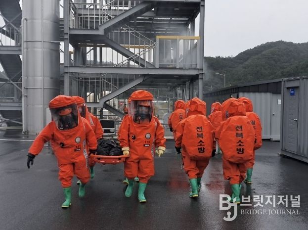 브릿지저널 윤나영 기자 | 전북특별자치도소방본부는 19일 호남119특수구조대(전남 화순군 소재)에서 호남권역 화학사고 대응역량을 강화를 위한 통합대응훈련을 실시했다.