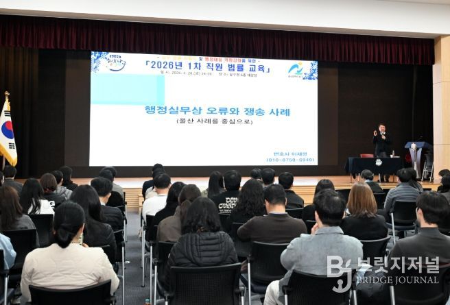 브릿지저널 윤나영 기자 | 울산 남구는 20일 구청 6층 대강당에서 직원 130여 명을 대상으로 ‘2026년 1차 직원 법률 교육’을 개최했다.