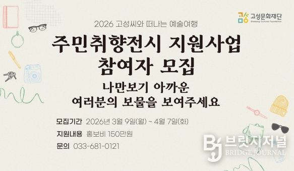브릿지저널 윤나영 기자 | 평화 경제 거점 도시 강원 고성군 산하 (재)고성문화재단은 주민이 자신의 취향과 삶의 이야기를 전시로 풀어내는 참여형 문화사업 ‘주민취향전시 지원사업’을 추진한다.