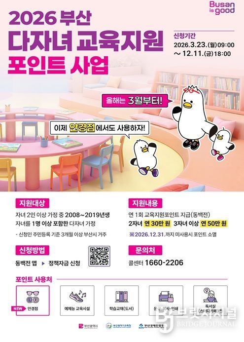 브릿지저널 윤나영 기자 | 부산시는 부산시교육청과 함께 학령기 자녀를 둔 다자녀 가정을 지원하기 위한 '부산 다자녀 교육지원포인트' 사업을 추진한다고 밝혔다.