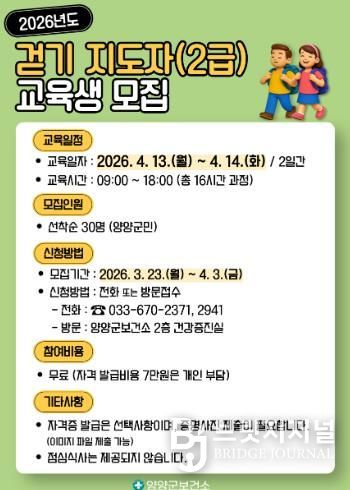 브릿지저널 윤나영 기자 | 양양군보건소가 지역사회 내 자발적인 걷기 실천 분위기를 조성하고 주민 건강 지표를 개선하기 위해 ‘2026년 지역사회 걷기지도자(2급) 양성 과정’을 운영한다.