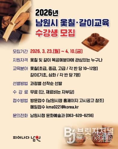 브릿지저널 윤나영 기자 | 남원시가 3월 23일부터 4월 10일까지 “2026년 남원시 옻칠·갈이 교육” 수강생 40명을 모집한다.