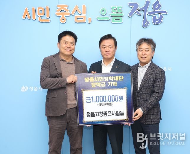 브릿지저널 윤나영 기자 | 정읍시민장학재단은 지난 23일 지역 모임인 ‘정읍고창좋은사람들(회장 박춘식)’이 지역 인재 양성을 위한 장학금 100만원을 기탁했다고 밝혔다.