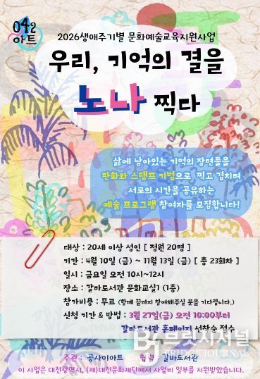 브릿지저널 정보영 기자 | 대전 서구 갈마도서관은 지역 예술단체 ‘공사이아트’, ‘문화기획 MTS’와 협력해 대전문화재단이 주최·주관하는 ‘생애주기별 문화예술 교육 지원’ 공모 사업에 선정됐다고 24일 밝혔다.