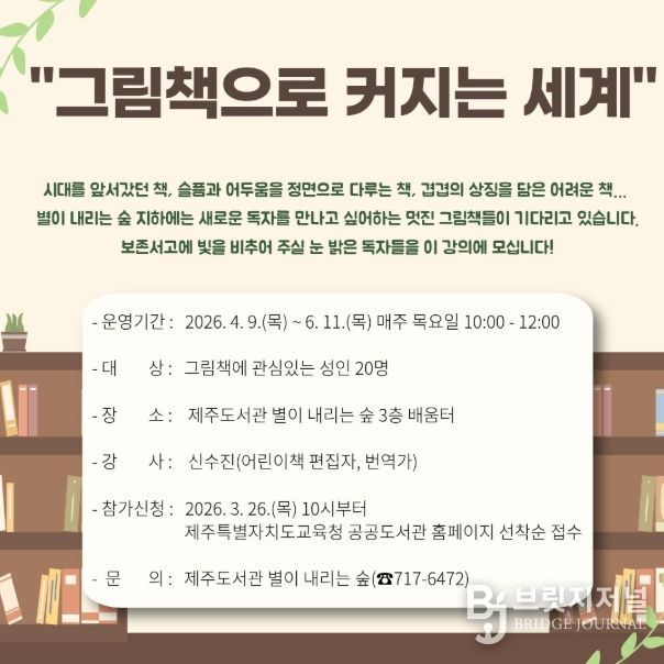 브릿지저널 정보영 기자 | 제주도교육청 제주도서관은 4월 9일부터 6월 11일까지 자료실 보존서고에 소장된 그림책을 재조명하고 지역주민에게 깊이 있는 독서 경험을 제공하기 위해 ‘그림책으로 커지는 세계’ 참가자를 모집한다.
