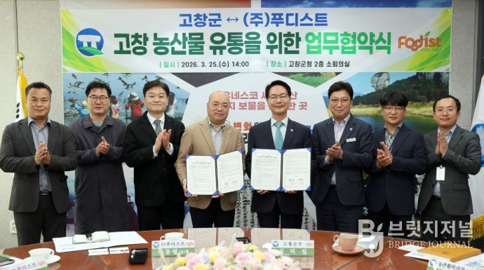 브릿지저널 윤나영 기자 | 고창군이 25일 군청에서 고인돌휴게소 운영사인 ㈜푸디스트와 업무협약을 체결하고, 지역인재 채용과 농특산품 마케팅 등에 협력하기로 했다.