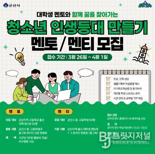브릿지저널 윤나영 기자 | 군산시는 관내 중·고등학생의 진로 탐색과 학습 역량 강화를 지원하기 위해 지역 출신 대학생이 참여하는 ‘청소년 인생등대 만들기’ 사업을 추진하고, 멘토와 멘티를 모집한다고 밝혔다.