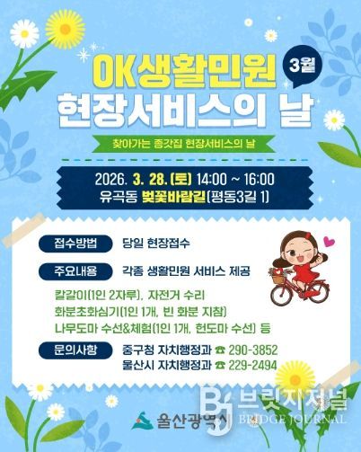 브릿지저널 윤나영 기자 | 울산시는 ‘2026년 오케이(OK)생활민원 현장서비스의 날’을 오는 3월 28일 중구 유곡동을 시작으로 본격 개시한다고 밝혔다.